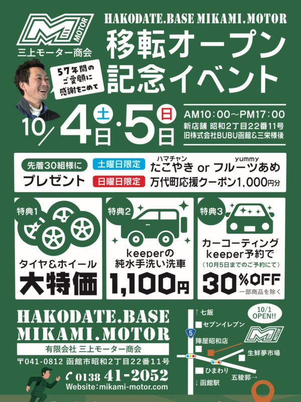 この度、弊社 有限会社 三上モーター商会は10月1日より新店舗 函館市昭和2丁目22-11の住所へ移転し新たなスタートをすることになりました。